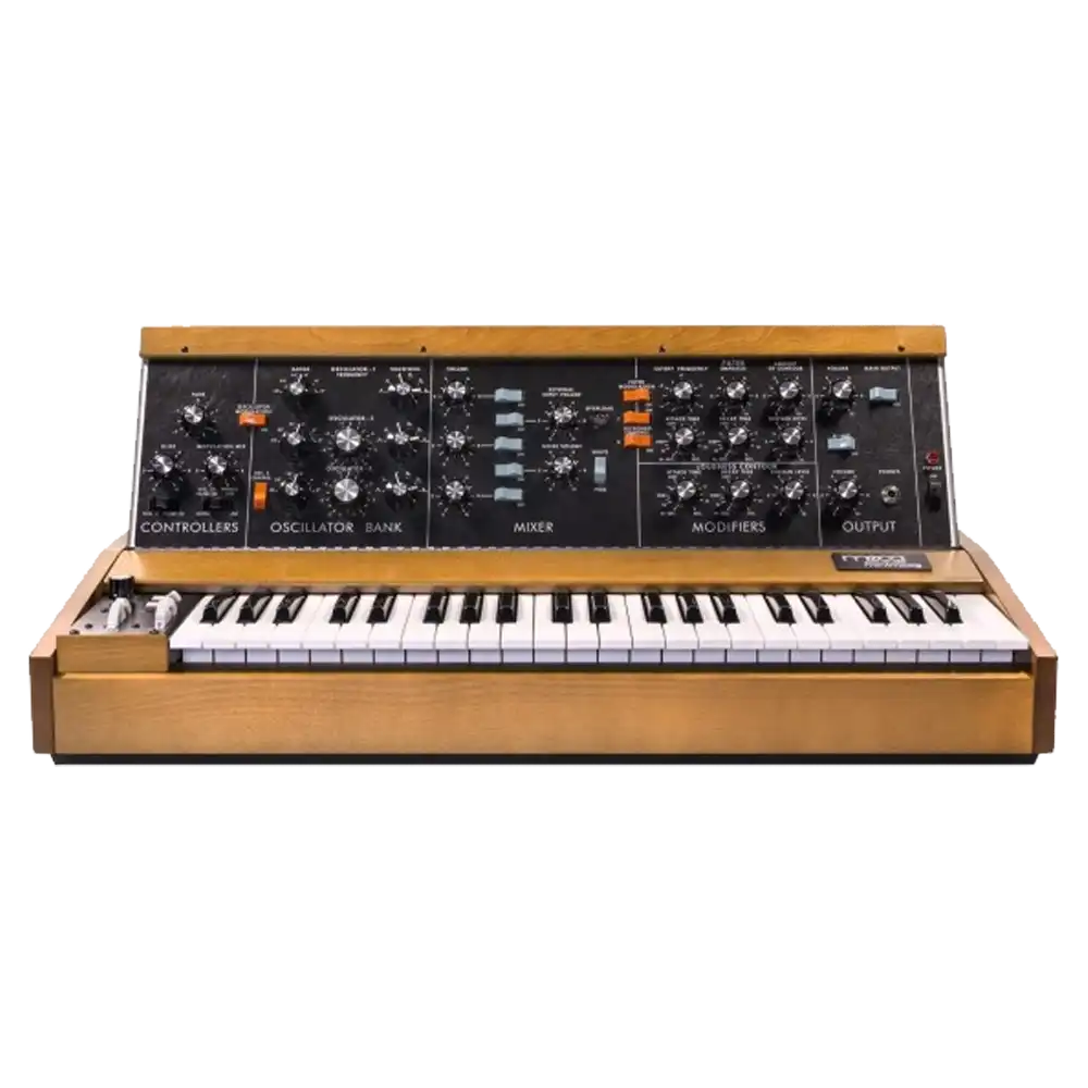 The Moog MiniMoog is an iconic analog synthesizer, famous for its rich, warm sound and intuitive interface. Its classic design and legendary sound make it a staple in both studio and live settings, offering unparalleled analog synthesis capabilities.